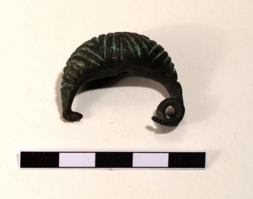 Fibula ad arco ribassato passante al sanguisuga, con staffa corta. Lo spessore dell'arco e la forma arrotondata fanno assomigliare tale tipo alle fibule a sanguisuga, quasi tutte attestate in area atestina. L'esemplare presenta una decorazione a linee impresse piuttosto marcate con un motivo a zig-zag.