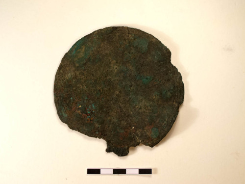 Specchio di forma circolare, sottile in bronzo, bordato con tre deboli cerchi copncentrici incisi.