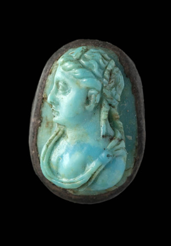 In un cammeo in turchese, legato in un castone d'argento dorato, è raffigurato un busto femminile, con la testa di profilo verso sinistra e in busto di tre-quarti, ricoperto da una veste con profonda scollatura. Da notare la complessa acconciatura, che scende in lunghi boccoli fin sulle spalle