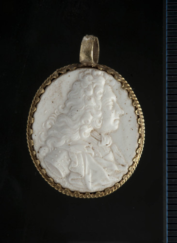 Cammeo in vetro, con raffigurazioni su entrambi i lati, legato in castone d'argento dorato con bordo a catena, con anello per la sospensione in alto. A: Busto di re Giorgio I d'Inghilterra e di Hannover (1660-1727), di profilo verso destra, tagliato sotto le spalle (da notare la ricca parrucca che scende sulle spalle con ampie ondulazioni e l'abito sfarzoso) B: Stemma del re, sormontato dalla corona e circondato da un'iscrizione (motto dell'Ordine della Giarrettiera)