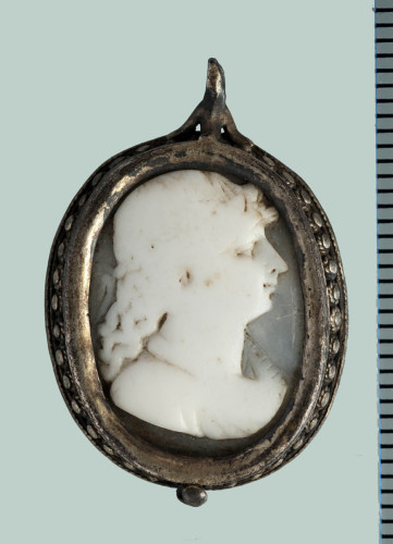Cammeo in conchiglia legato in castone d'argento dorato con bordo a maglie intrecciate, con anello per la sospensione in alto. Busto femminile di profilo verso destra, tagliato al di sotto delle spalle. Da notare la folta capigliatura, che scende in ciocche ondulate sulle spalle, probabilmente trattenuta da una coroncina (di cui si intravedono i lacci annodati sulla nuca). Il profilo è caratterizzato dall'occhio piccolo, dal naso lungo, con narice incisa e il mento sfuggente, mentre attorno al collo un po' tozzo si dispone una veste scollata.