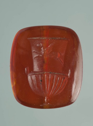 In una corniola di forma rettangolare è inciso un grande vaso da vino (cratere), con piccolo piede; parte inferiore, decorata con baccellatura, si cui si impostano due piccole anse; la parte superiore è decorata con una figura di cavallo alato in volo di profilo verso destra. L'intaglio è pulito, lo stile classicistico