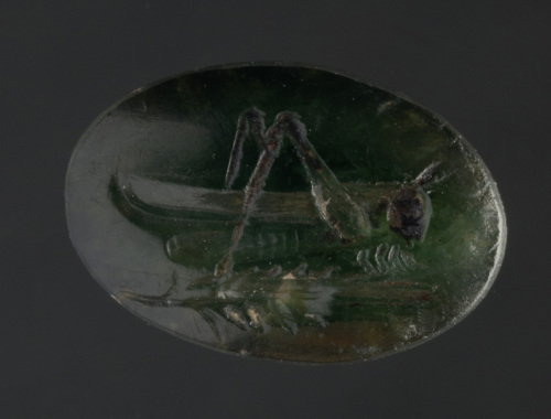Sul prasio verde è raffigurato un insetto (una cavalletta) su spiga, rappresentato di profilo verso destra; lo stile è preciso e ben dettagliata l'anatomia dell'insetto; la raffigurazione è disposta in senso orizzontale