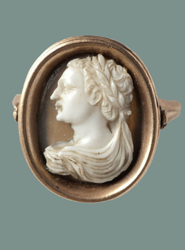In un cammeo, legato in un anello d'oro a cerchio sottile desinente in decorazione a rosetta, è raffigurato un busto maschile, tagliato al di sotto delle spalle, con corona d'alloro, di profilo verso sinistra. I capelli corti resi a piccole ciocche scomposte lasciano scoperto l'orecchio. Il volto è caratterizzato dalla fronte alta e il naso aquilino. L'elemento particolare della raffigurazione è costituito dalla corona d'alloro, da cui scende un lembo del manto, che scende in fitte pieghe ad avvolgere il busto.