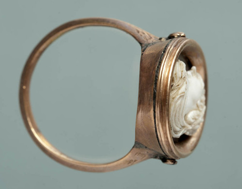calcedonio-agata (pietra a due strati) con fondo convesso; cammeo (legato in anello d'oro)