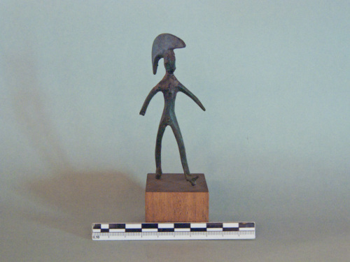 figura maschile di guerriero caratterizzato da elmo con cimiero a profilo semilunato, capo a profilo circolare, braccia scostate dal corpo,capezzoli e ombelico sono stati resi con piccoli cerchi incisi, i genitali risultano appena accennati, la gamba sinistra è posti in avanti. Attribuibile a un marte in assalto. Sotto i piedi si evidenziano due appendici da connettere alla fusione.