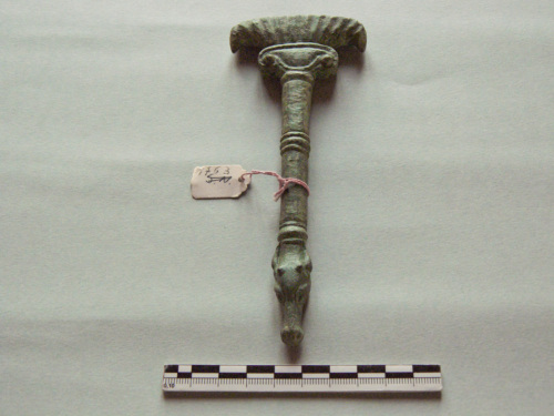 Manico di specchio con sezione circolare, terminazione superiore a foglie stilizzate impostata sopra a elemento a profilo ellittico con bordino rilivato. Terminazione inferiore a protome di cervo.