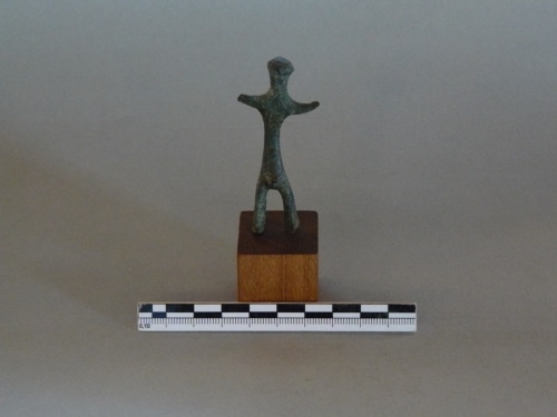 Bronzetto di devoto, la testa ha profilo a capocchia, non sono segnati i tratti del volto. Il corpo è trattato in maniera sommaria, le braccia sono allargate, i genitali sono segnati da una protuberanza e le gambe risultano divaricate.