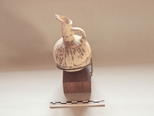 piccola brocca con beccuccio a orlo arrotondato, collo cilindrico, corpo a profilo emisferico, sulla spalla si imposta un'ansa verticale a sezione subrettangolare, apodo. La decorazione si conserva parzialmete alla base del collo dove si individua un motivo a linee parallele e sul corpo con motivi a spina di pesce alternati a linee verticali, sul fondo fasci di linee che si intersecano. Impasto di colore beige; la decorazione è stata realizzata con vernice marrone.Il reperto per la tipologia della decorazione è da attribuire alle fasi avanzate della media età del bronzo, riferibile quindi alla "white painted ware".