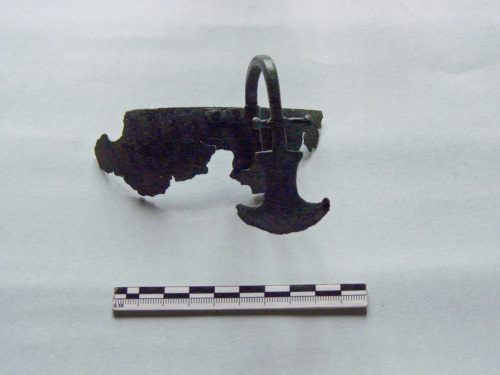 Parte superiore di capenduncola in lamina a corpo emisferico. La decorazione incisa è collocata alla base dell'orlo con motivi a denti di lupo. Probabilmente legato a un intervento di restauro antico è il fissaggio di un manico a sezione subrettangolare, con attacco a croce e all'altra estremità un elemento con profilo ad ascia.