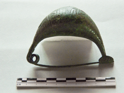 fibula a sanguisuga con staffa corta, arco è decorato ad incisione con motivi a meandro e triangoli campiti da brevi tratti, molla a due avvolgimenti.