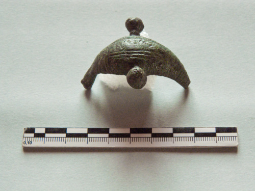 Fibula ad arco a sezione romboidale, con bottoni laterali, decorazione a fasci di linee incise; priva di molla e staffa.