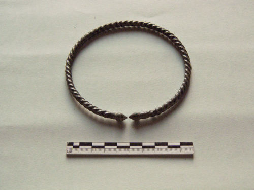 Bracciale rigido a sezione subcircolare, a tortiglione e con terminazione a pigna.