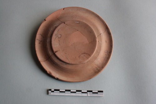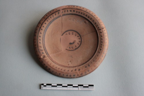 Piatto apodo in argilla rosa-bruno e decorato con vernice bruno scuro. L'orlo è ampio e leggermente rovesciato verso il basso; il piede a disco piatto. Sull'orlo corre una decorazione estremamente semplificata, per cui le foglie della ghirlanda hanno assunto un aspetto puntiforme e si svolgono in una doppia serie ai lati di una riga centrale. Al centro del piatto è presente una decorazione a rosetta formata da un giro di fogliette tra due linee concentriche. Fa parte di un gruppo di piatti etruschi databili agli inizi del V secolo a.C. classificati da Beazly nel gruppo dei "Piatti con ghirlanda a punti".