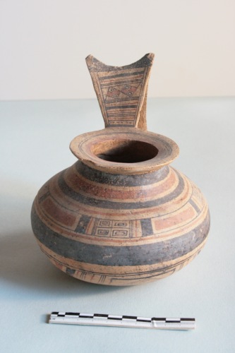 Brocca geometrica daunia a decorazione bicroma in argilla giallo-crema porosa e impura con superficie giallo-arancio. L'ansa è a gomito con sella pronunciata, l'imboccatura ad ampio orlo, il corpo emisferico schiacciato ai poli. Il vaso è apode. Decorazione in bruno e rosso mattone: il collo è decorato a fasce alternate rosse e brune; sul corpo motivo a riquadri iscritti, che si ripete per tre volte alternato a larghe fasce orizzontali rosse; ampia fascia bruna lungo il punto di massima espansione; nella parte inferiore al centro motivo a rombo con quadrati iscritti, inquadrato da fasci di linee diagonali rosse e brune, ai lati due motivi a cerchi concentrici; sotto l'ansa fascio di linee verticali rosse e brune; sul fondo motivo a doppio rombo con lati concavi e doppia croce iscritta circondato da fascia circolare bruna. La decorazione è resa in gran parte illeggibile da diffuse incrostazioni e sbrecciature. Sul fondo sono presenti resti di ossidazione di colore verde dovuto a contatti con metalli.