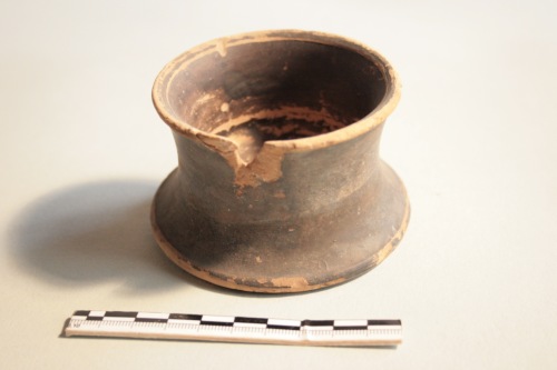 Saliera in vernice nera in argilla beige chiaro e vernice nera opaca cotta malamente. Il vaso presenta una coppa profonda con profilo esterno a curva concava continua dall'orlo superiore al breve orlo del piede ad anello, e un piede con breve base d'appoggio e ampia superficie interna piatta. L'orlo superiore è a risparmio. Sulla vernice nera sono diffuse le abrasioni e mancano alcuni frammenti dell'orlo. La forma è quella delle "saliere" attiche del V secolo a.C. che si diffonde in Occidente nei secoli successivi. Il vasetto di Torcello trova numerosi confronti in ambiente etrusco e nella Valle Padana, in particolare ad Adria.