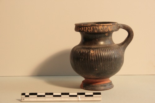 Piccola brocca strigilata a vernice nera in argilla beige rosato con ingubbiatura rosa violaceo e vernice nera a riflessi metallici. Il corpo del vaso è schiacciato, il collo è a gola accentuata separato dal corpo da un piccolo orlo, la bocca è rotonda con bordo rovesciato all'esterno, l'ansa è bifida alla sommità con due protuberanze laterali, il piede è troncoconico cavo con solco orizzontale a metà dell'altezza e con breve stelo a gola. Il collo del piede e il fondo sono a risparmio. Sull'orlo rovesciato vi sono una serie di ovuli impressi; invece sul corpo strigilature regolari; sotto l'attacco inferiore dell'ansa, un grande segno ad "x" impresso. E' mancante di un frammento del piede e la vernice nera è in più punti screpolata. Il vasetto risente ancora dell'influenza della produzione attica di vasi strigilati e con decorazione impressa che tanto favore ebbero in Occidente dove furono per lungo tempo imitati. Nonostante le modeste dimensioni, conserva infatti una certa eleganza nella sintassi decorativa degli ovuli sull'orlo e della sottile strigilatura che insieme alla lucentezza della vernice garantiscono un sicuro effetto armonioso.
