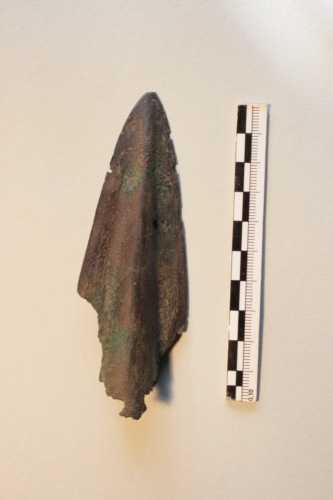 Punta di lancia in bronzo con patina di colore scuro. Lama con innesto a cannone (rotta alla base delle alette; immanicatura frammentaria).