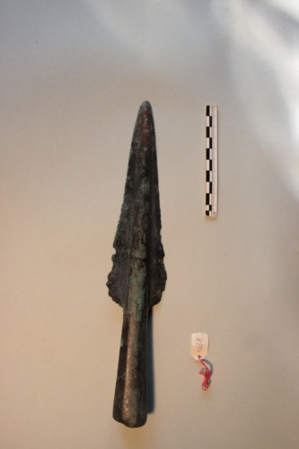 Grande punta di lancia in bronzo con patina verde scuro. La lama è grande e foliata, a base ovale con costolatura mediana (margini delle alette frastagliate nelle parti basali), immanicatura a cannone di lunghezza inferiore a quella della lama e a sezione poligonale con foro per il fermo. Callegari annota la presenza sulla cuspide di lettere runiche, fra un cerchietto e un arco, e sul rovescio a sinistra un grande arco con tre semicerchi alle estremità, a destra un triskele e una svastica, ambedue con tre stelline alla fine delle linee. Si tratta di una punta di lancia di grandi dimensioni che trova confronto con esemplari della prima età del ferro dall'Etruria. Particolarmente significativo il confronto con un esemplare rinvenuto nell'abitato di S. Basilio di Ariano Polesine.