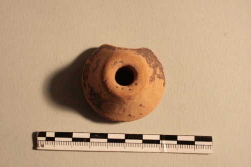 Fusarola in terracotta, utilizzata per appesantire i fusi (ma non è escluso anche un utilizzo come pesi da telaio o da rete).La forma molto semplice si mantenne per secoli, tanto che non è possibile una precisa attribuzione cronologica.