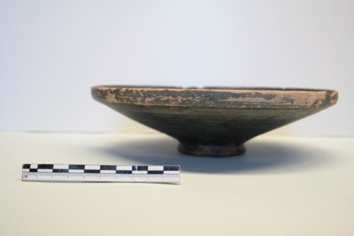 Piatto a vernice nera in argilla giallina sottile e polverosa e vernice nera opaca tendente al bruno con macchie rossastre di cottura. Il piatto è a vasca bassa e larga, il profilo delle pareti è nettamente troncoconico con orlo verticale e piedino ad anello con fondo umbilicato. Al centro della coppa è presente un cerchio rosso-bruno per sovrapposizione di un altro piatto durante la cottura. Sono visibili segni di strumento sulle pareti esterne. La base d'appoggio è a risparmio. Verso il piede vi sono sbavature di vernice. La vernice nera tende a sollevarsi ed è in più punti scomparsa. Il piatto è mancante di alcuni frammenti dell'orlo. Questo piatto ha avuto larga diffusione, oltre che in ambiente etrusco, anche nella Valle Padana, in particolare ad Adria e ad Altino. Per confronti con esemplari del tutto uguali, il piatto di Torcello è databile alla prima metà del II secolo a.C.