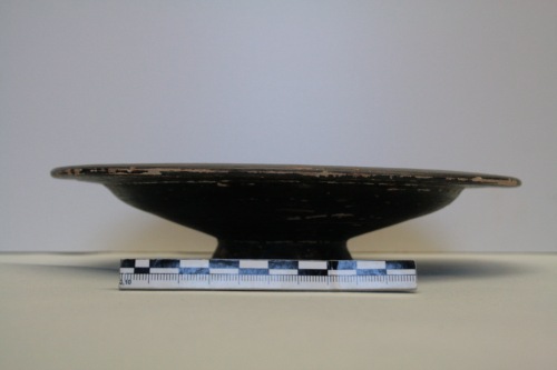 Piatto a vernice nera in argilla rosa-grigio e vernice nera opaca quasi bruna. Largo piatto con ampio orlo orizzontale e piedino troncoconico con centro umbilicato. Segni dello strumento sulla parte inferiore dell'orlo. La base d'appoggio è risparmiata. La vernice nera è in più punti screpolata. Questa forma è diffusissima non solo in ambiente etrusco ma anche nel territorio veneto, in particolare ad Adria.