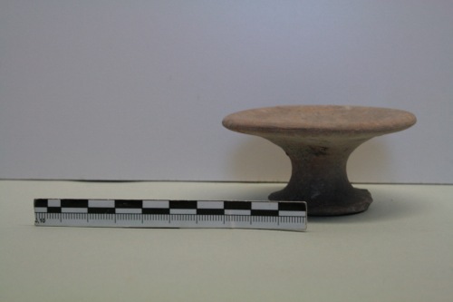 Piattello su piede a vernice nera in argilla rosa-giallo e tracce di vernice bruno scuro. Il piattello è caratterizzato da una piccola cavità al centro della coppa a pareti imbutiformi e un breve stelo su piedo discoide. Probabilmente, per la forma inconsueta ad imbuto, più che di un piccolo piatto potrebbe trattarsi di un supporto per un vaso a fondo rotondo. Forme simili, ma acrome e un pò più allungate,si trovano a Capua e vengono considerati "vasetti votivi".