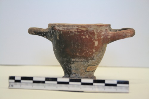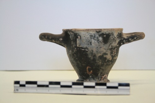 Skyphos in miniatura a vernice nera in argilla chiara e vernice nera opaca in gran parte rossa per difetto di cottura. Lo skyphos ha profilo delle pareti carenato verso il piede a toro e grosse anse a bastoncello impostate sotto l'orlo. Il fondo è a risparmio. Sulla superficie sono diffuse le incrostazioni. Nel piccolo skyphos non sono rispettate le proporzioni tra le varie parti del corpo e soprattutto le anse conservano una misura pressochè normale, conferendo a questa miniatura un aspetto pesante.