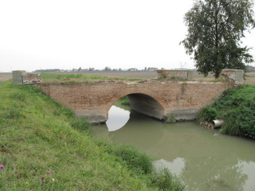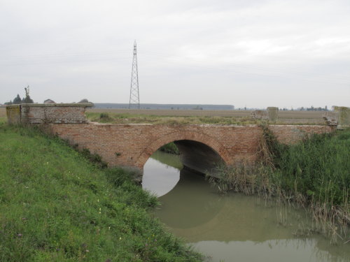 ponte in muratura continua a vista a canna ad arco a tutto sesto con ali inclinate e passaggio in terra. Manufatto con pianta a doppia C e tracce di parapetto in muratura a vista.