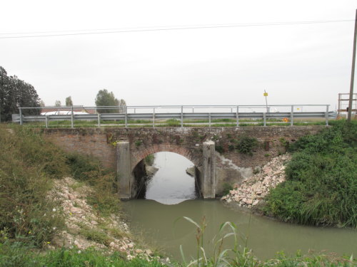 ponte e sostegno in muratura continua a vista a canna ad arco a tutto sesto a pianta rettangolare con parapetti in ferro "a giorno" con guardrail, passaggio asfaltato.