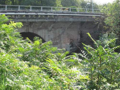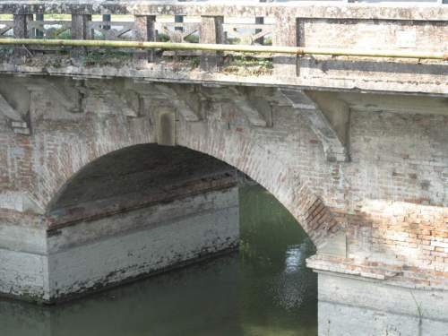 ponte in muratura continua a vista a canna ad arco a tutto sesto con pianta rettangolare e passaggio asfaltato, parapetti in calcestruzzo e muratura, presenza di guardrail.