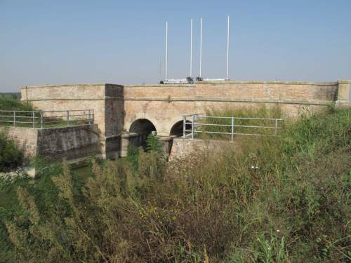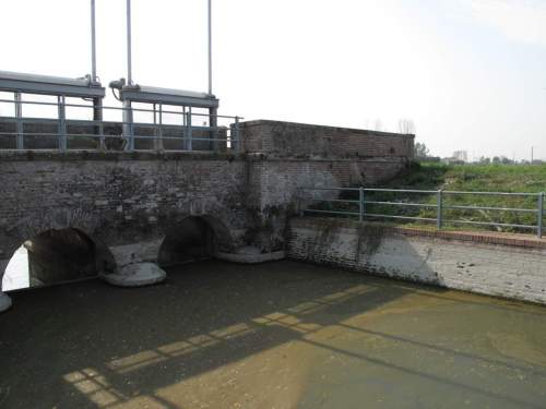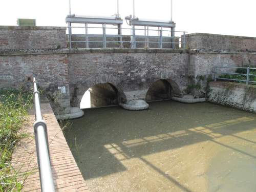 ponte sostegno in muratura a vista con doppia canna ad arco a tutto sesto con parapetti pieni in muratura rifiniti con cordoli in pietra, presenza di chiuse in ferro sul prospetto a monte raggiungibili attraverso il ponte di servizio. Manufatto a pianta a doppio C con rientri centrali e passaggio in terra.