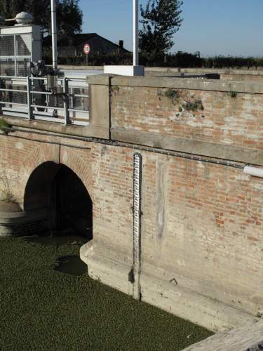 struttura in muratura continua a vista con tripla canna ad arco a tutto sesto poggiante su rostri, pianta rettangolare con rientri centrali, presenza di ponte di servizio nel prospetto a monte con parapetto in ferro e passaggio asfaltato. Presenza di strumenti idrometrici sui prospetti.
