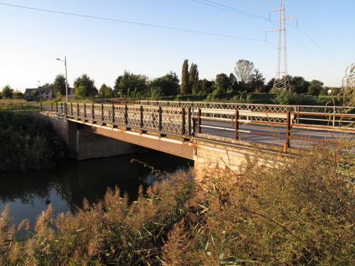 ponte a canna quadra con spalle in muratura continua a vista e trave in ferro, parapetti metallici di diversa tipologia, nella parte centrale riporta un disegno a losanghe.