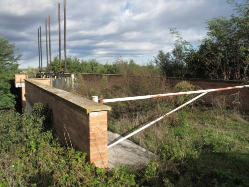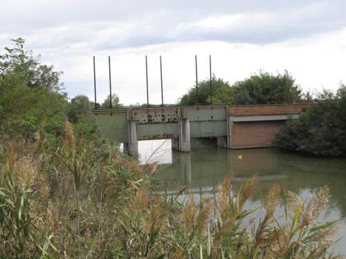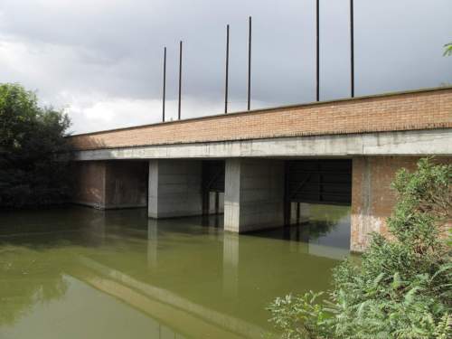 ponte sostegno in muratura a vista e cemento armato con tripla canna quadra provvisto di paratoie metalliche nel prospetto a monte, passaggio in terra con ponte di servizio, pianta rettangolare con rientro centrale sul lato a monte.