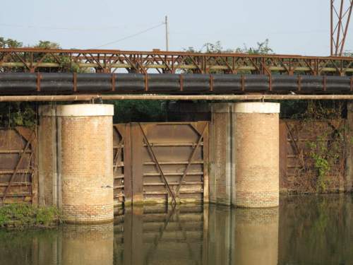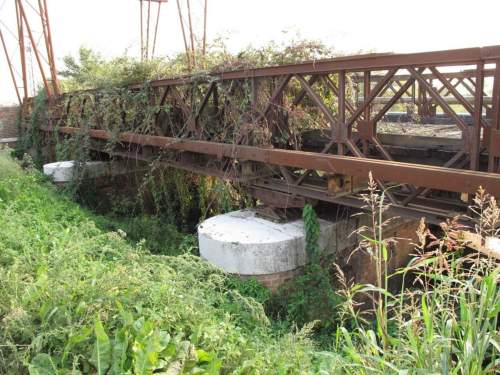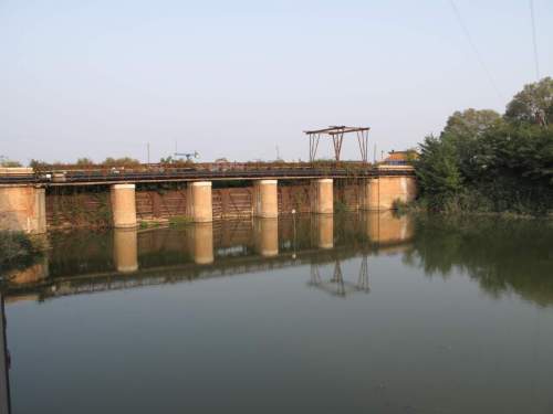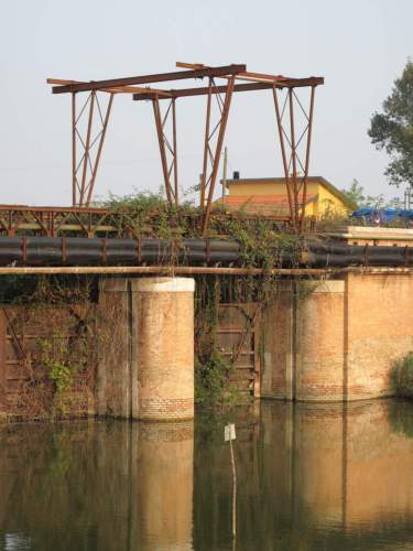 struttura in muratura continua a vista a travata a canna quadra con cinque chiuse metalliche scndite da possenti rostri curvilinei in muratura rifiniti in pietra sui quali poggia una complessa struttura metallica composta da parapetti metallici e panconature lignee. Spalle in muratura con parapetti pieni rifiniti con copertine in pietra, presenta pianta a doppia C.