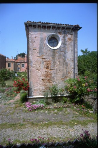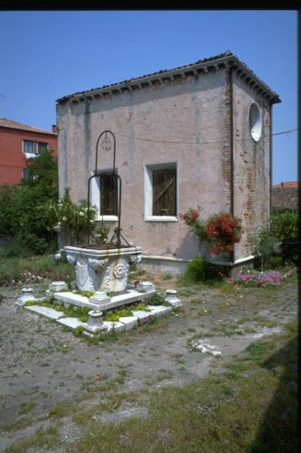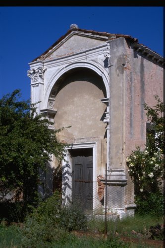 edificio di forma rettangolare, muri perimetrali intonacati, copertura a tetto in coppi, facciata principale in pietra dIstria delimitata da pilastri esterni, arco a tutto sesto decorato con motivi rinascimentali, frontone superiore, portone di ingresso con stipiti in pietra dIstria