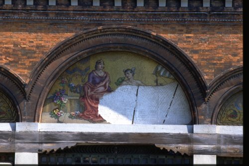 portale formato da una struttura di quattro pilastri quadrati in pietra dIstria che subdividono il prospetto in tre zone, due più strette situate ai lati ed una centrale, i quattro pilastri collegati superiormente con elementi in pietra dIstria sostengono una parte superiore in muratura e tre archi con mosaici al suo interno.