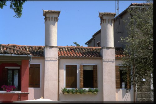 edificio di forma rettangolare con facciata principale simmetrica rispetto allasse centrale di costruzione con coppia di camini cilindrici; tetto a padiglione in coppi