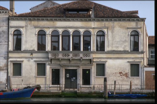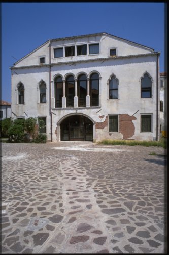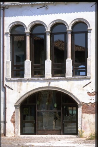 edificio di forma rettangolare con facciata principale simmetrica rispetto allasse centrale di costruzione con quadrifora al primo piano e balaustrata in pietra dIstria retta da mensole; facciata secondaria con al piano terra arco a sesto ribassato, quadrifora al primo piano con ai lati finestre in stile gotico trilobate, piano mansardato di nuova edificazione, tetto a padiglione con abbaino ai due lati in coppi