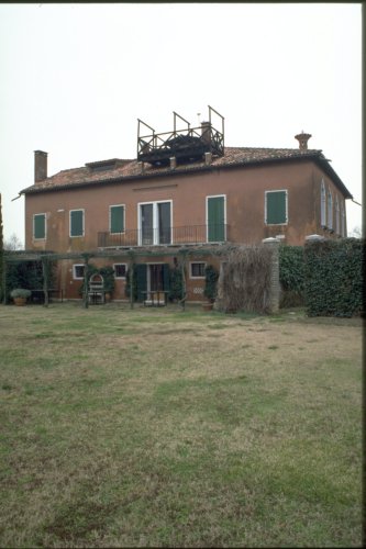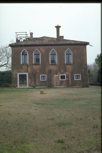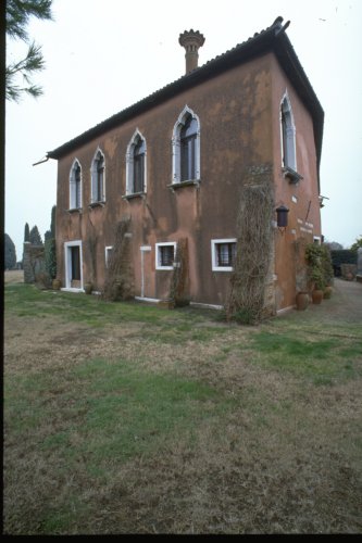 edificio di forma irregolare, pareti in muratura intonacata, copertura a tetto a tre falde con altana nella parte a Sud Est; tre contrafforti disposti sul lato Nord; ingresso principale posto ad Ovest sul canale prospiciente; finestre gotiche presenti sui lati Ovest e Nord al primo piano, nei rimanenti prospetti finestre rettangolari con stipiti in pietra dIstria; il prospetto a Est, con affaccio sul giardino, presenta un pergolato in struttura metallica; al primo piano balcone sorretto da mensole in pietra dIstria e con ringhiera metallica; sul prospetto Nord tracce di un precedente ingresso.
