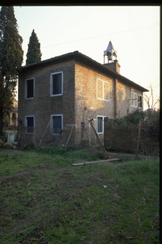 edificio di forma rettangolare, pareti perimetrali in mattoni faccia a vista, copertura a tetto a padiglione, torre campanaria sulla sinistra della facciata con cella campanaria in pietra dIstria, scala esterna rettilinea in mattoni faccia a vista e pietra dIstria posta al centro del prospetto Sud Ovest, bifore gotiche con arco trilobato al primo piano.
