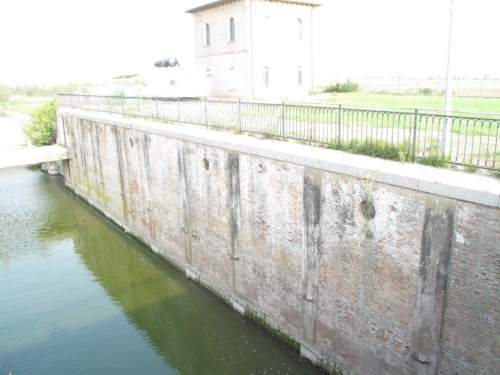 resti strutturali idraulici, compresenza di setti murali in muratura in laterizio a vista con piccola forometria circolare seriale, conclusi da copertine in materiale artificiale, presenza di un parapetto in ferro lungo i setti murali.