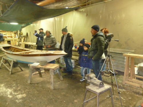 Sullo sfondo Matteo Tamassia sta lavorando ad una imbarcazione, condividendo lo spazio dello squero per sue attività di piccola cantieristica marinara. La compresenza di più artigiani all'interno dello squero, oltre ad ottimizzare le spese del suolo veneziano sempre molto alte, è funzionale anche ad aiuti estemporanei per operazioni fisicamente impegnative. In primo piano si trova Mauro Barugolo, committente della gondola in costruzione, assieme ai suoi due figli piccoli, la suocera ed un amico. Il gruppo è venuto in visita esplicitamente per assistere al capovolgimento della gondola, una delle fasi più importanti, essendo il momento in cui la barca si rivela per la prima volta nella sua struttura, pur non ancora completa. La presenza del gruppo di famiglia, oltre all'amico, mostra il valore attribuito a questa imbarcazione, sicuramente strumento di lavoro essenziale, ma anche oggetto investito di significati affettivi da condividere nella sfera parentale e amicale più stretta.