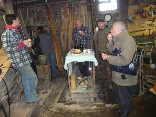 Matieu lo stagista francese con l'ausilio di una scala a pioli sistema uno dei due argani usati per sollevare e capovolgere la gondola. Si vede come le travature del soffitto fungano da deposito per strumentazioni ed oggetti impiegati solo occasionalmente; per esempio le sedie di plastica bianca usate in occasione di conferenze ed eventi vari organizzati presso lo squero. Come di consueto a Venezia lo spazio è limitato, e l'organizzazione del lavoro necessita uno stoccaggio strategico di tutto ciò che non è in funzione. L'ambiente dello squero è perfettamente a misura per la costruzione delle imbarcazioni tradizionali a cui è deputato, ma l'ordine è essenziale per una ottimizzazione dellimpiego dello spazio. Una voce proveniente fuori campo chiede Mateo se finìa a sopressa? ricordando come lo squero è luogo di lavoro ma anche di socialità. È usuale infatti che clienti e amici vengano in visita, magari per dare una occhiata a una imbarcazione (propria o di conoscenti o parenti) in costruzione, portando libagioni (dobbligo il vino oltre a qualche tipo di companatico) da consumare in loco.