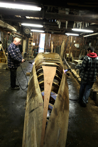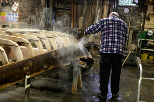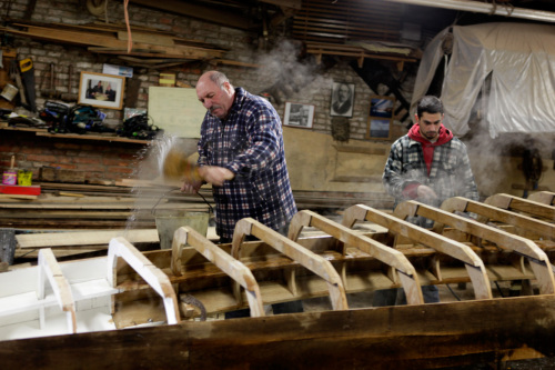 L'operazione di torcitura del #sercio# richiede tempo. Roberto Tramontin da seduto procede a scaldare, tramite fiamma alimentata a gas, la tavola che deve essere fatta aderire e quindi fissata alla costolatura. Contemporaneamente a intervalli regolari spruzza il legno con dell'acqua per evitare che si bruci. Man mano che il legno si scalda e quindi si ammorbidisce, lartigiano. aumenta l'avvitatura dei morsetti che piegano la tavola. In passato per questo tipo di operazione erano impiegate delle canne palustri che sembra bruciando fornissero un caldo umido e non violento adatto ad ammorbidire il legno senza seccarlo ne bruciarlo. Alcune di queste canne sono ancora conservate nello squero stivate tra le travi del soffitto.