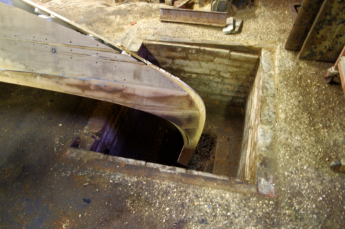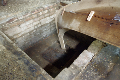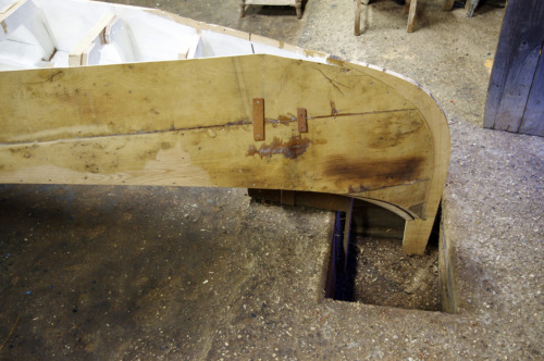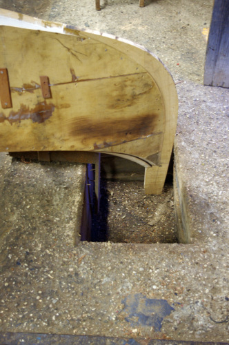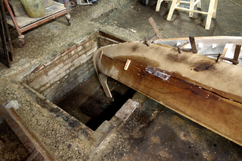 Michele Pulliero, giovane apprendista all'interno dello squero, descrive le fasi di lavorazione della gondola dopo che è stata liberata dal cantiere (#cantier# matrice su cui sono assemblate le prime assi). La #fracadura# è la procedura tramite la quale la gondola acquista la caratteristica forma a mezzaluna. E il grado di curvatura è scelto dal gondoliere. A questo proposito l'artigiano ci tiene a precisare la particolarità dello squero in cui lavora, in grado di realizzare delle gondole come pezzi unici. Quando ci sarà la #fracada# imbananatura della barca, la poppa e la prua verranno, sempre scaldando, schiacciate con delle punte dal soffitto finché non si riesce ad arrivare ad avere la linea che il gondoliere richiede. Questa è la nostra forza, il fatto che noi riusciamo a personalizzare la barca il più possibile. Mentre in un altro cantiere la barca esce dallo stampo, dal cantiere ed è quella che hai. Invece il bello di questo posto è che riusciamo a personalizzare il più possibile la linea della barca. Viene spiegato anche l'uso dei due buchi presenti alle estremità opposte del pavimento dello squero, essenziali per la lavorazione di imbarcazioni tipiche veneziane con le estremità rialzate. I fori servono per la gondola e anche per la #batèa# a coda di gambero, che hanno le estremità molto alte. Nei fori infatti vengono inserite le punte di poppa e di prua, in maniera che la barca capovolta si trovi ad altezza comoda per essere lavorata. Invece altre barche come la #mascareta# vengono girate per la manutenzione senza bisogno delle buche. Michele spiega anche il significato di battere la barca e andare alla banda: «Se tu la batti vuol dire che la giri, se tu vai alla banda vuol dire che la metti sul fianco. Quando io pitturo questo fianco andiamo alla banda nel fianco di là». Battere la gondola significa dunque girarla e metterla con il fondo verso laltro. Le barche dello squero Tramontin hanno unaltra particolarità, che facilita il lavoro allo squerarolo, rendendolo più sicuro: «Le barche di Roberto, che facciamo noi, sono le uniche che se tu le appoggi sul fianco restano sul fianco. Qualsiasi altra gondola cade, perché ha il baricentro diverso».
