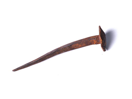 Asta metallica in ferro di medie dimensioni, di sezione quadrata e di produzione artigiana, rastremata e appuntita da una parte e con testa a base circolare leggermente bombata e sfaccettata. Il gambo è leggermente ricurvo.