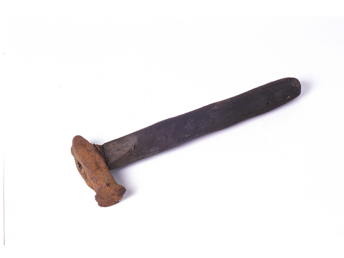 Massello costituito da una testa e una bocca a punta, il ferro presenta una superficie irregolare. La testa è piatta e di forma quasi circolare, con bordi dilatati e a tratti piegati verso l'esterno e fortemente slabbrati. Nel tratto prossimo alla punta del massello è stato praticato un occhio in cui è inserito un bastone, annerito dall'uso, che funge da manico. Dalla testa il massello va leggermente e gradatamente restringendosi fino al tratto prossimo al manico dove si allarga per tutta la larghezza dell'occhio e quindi si restringe nuovamente fino a terminare con un apice irregolare e scheggiato, forse un tempo recante una figura da stampare. Gli spigoli del tratto di massello compreso tra la testa ed il bastone sono smussati, quelli tra il bastone e la punta sono spigoli vivi. Il bastone, a sezione quasi ovale, va leggermente assottigliandosi alla base ed è ridotto di spessore nel tratto in cui è inserito nel massello.
