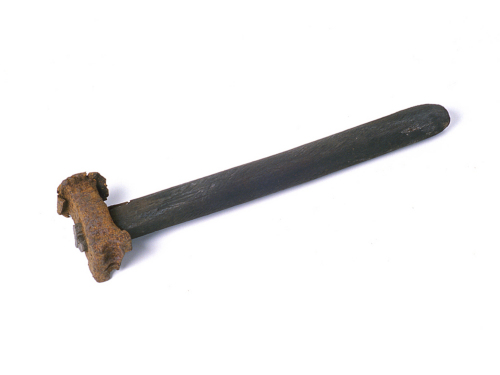 Massello costituito da una testa e una bocca con sagoma per stampo. La testa è piatta e di forma quasi circolare e con bordi dilatati e fortemente slabbrati. Al centro del massello è stato praticato un occhio in cui è inserito un bastone, annerito dall'uso, che funge da manico. Il massello è costituito da un corpo centrale squadrato con spigoli smussati che va leggermente diminuendo di spessore nel tratto prossimo alla testa. Il tratto compreso tra l'occhio e la bocca ha la superficie delle facce verticali leggermente concava e aumenta di spessore all'altezza della bocca. La bocca è a sezione rettangolare e ha la superficie percorsa da una concavità che si sviluppa orizzontalmente rispetto all'asse veritcale di simmetria dell'occhio. All'interno della concavità sono state incise delle scanalature ad essa ortogonali, profonde poche millimetri, di cui una a sezione quadrata e l'altra di forma indefinibile per la mancanza di un parte della bocca.